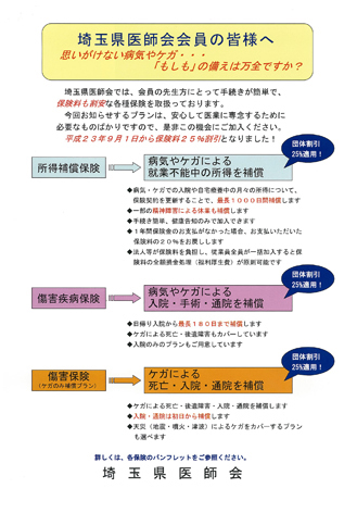 埼玉県医師会では、会員向けに以下の保険を取り扱っており、一般の個別契約